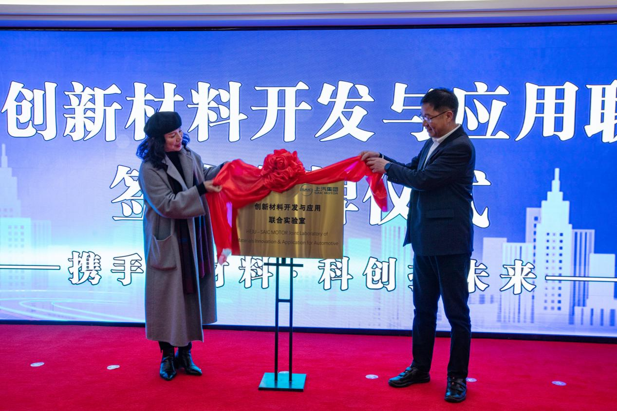 活動(dòng)中,上汽集團(tuán)中心實(shí)驗(yàn)室總監(jiān)閔良與與合聚集團(tuán)名譽(yù)董事長(zhǎng)方琳共同為合聚—上汽創(chuàng)新材料開發(fā)與應(yīng)用聯(lián)合實(shí)驗(yàn)室揭牌,并互贈(zèng)禮物。